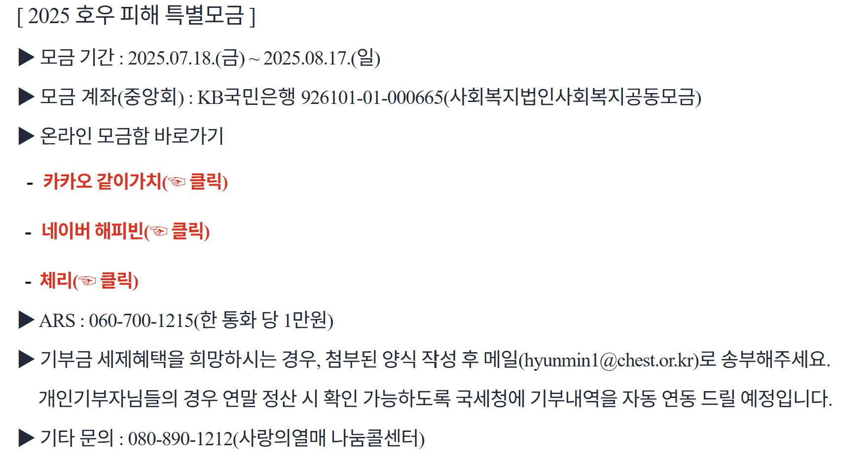 - 입금 시 ‘호우피해 성금’ 등 표기 권장