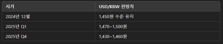- 원화 회복 가능성: 한국의 수출 실적 개선과 금리 안정화가 진행되면 원화 가치가 점차 회복될 가능성.