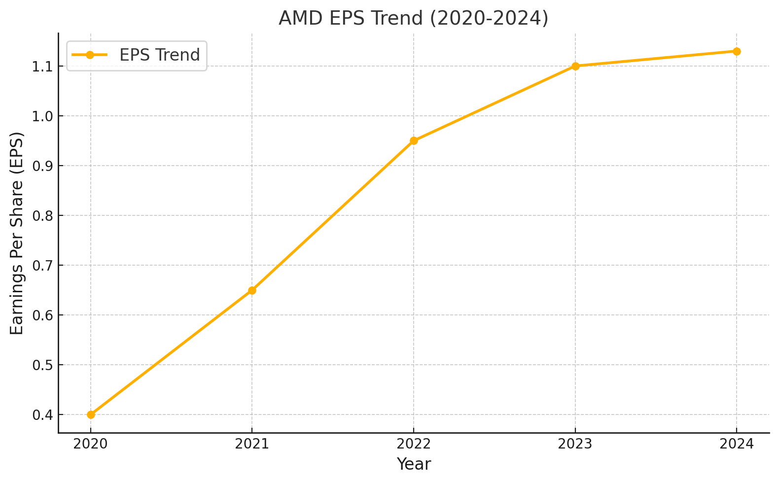 지난 5년 동안 AMD의 EPS는 2020년 $0.40에서 2024년 $1.13으로 꾸준히 상승하며 안정적인 성장세를 보였습니다. 이는 AI, 데이터 센터, 게임과 같은 고성장 시장에서의 성공적인 사업 확장을 반영합니다. 2023년에서 2024년 사이 성장세가 다소 둔화된 것은 경쟁 심화와 시장 포화의 영향을 시사하지만, AMD의 강력한 혁신 파이프라인과 다각화된 포트폴리오는 장기적인 수익성을 지속적으로 뒷받침할 것으로 보입니다.
